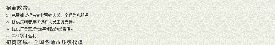 安徽亳州金馬古池酒業有限公司 版權所有 Copyright © 2010-2029 酒商網(m.tycmwm.com) All rights reserved.免責聲明:以上所展示的酒水信息由企業提供,內容的真實性、準確性和合法性由酒水企業自行負責。酒商網對此不承擔任何責任。 如果您希望管理本企業信息,或者需要更新/刪除/修改相關信息,請聯系平臺技術支持人員!本站只起到信息展示作用,不為交易經過負任何責任,請雙方謹慎合作,以確保您的權益!任何單位及個人不得展示欺騙性產品信息!
