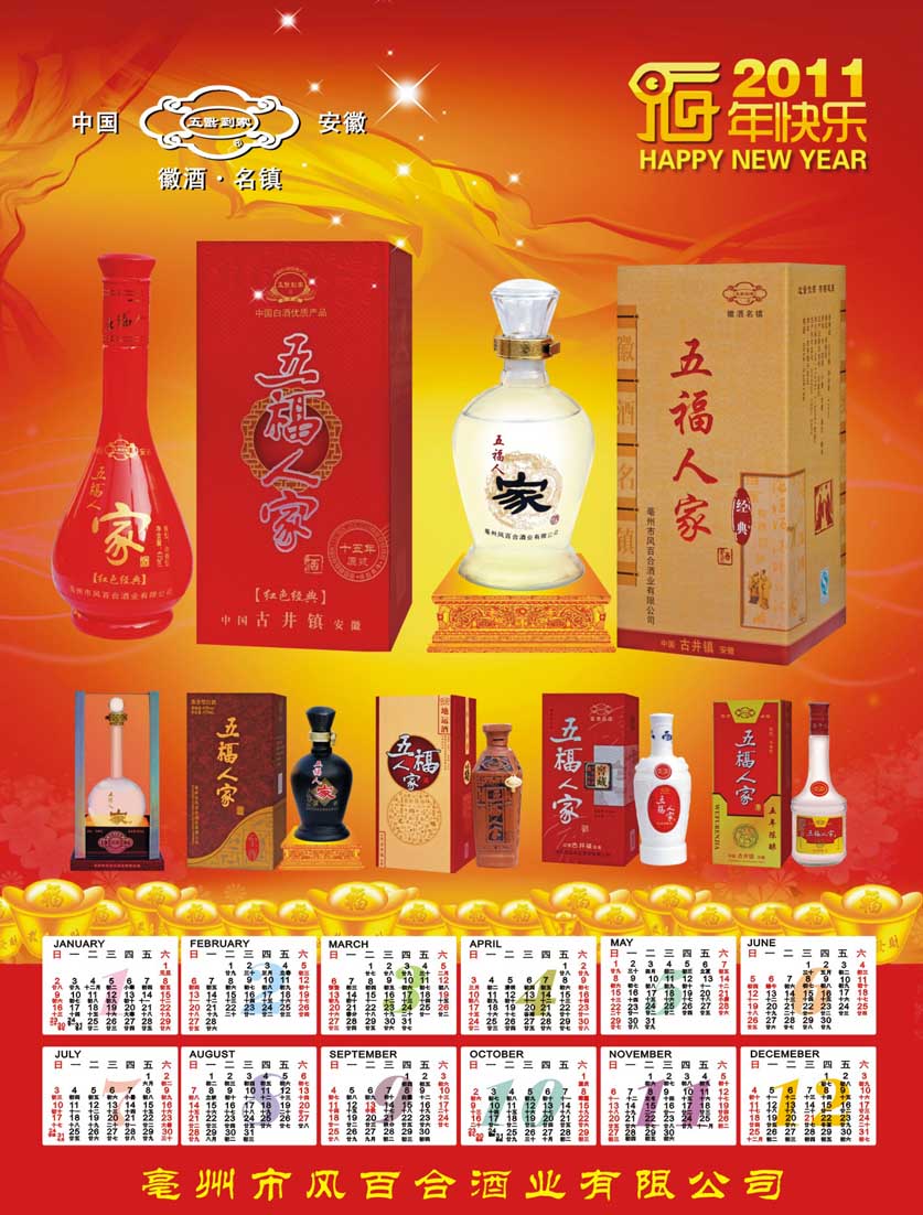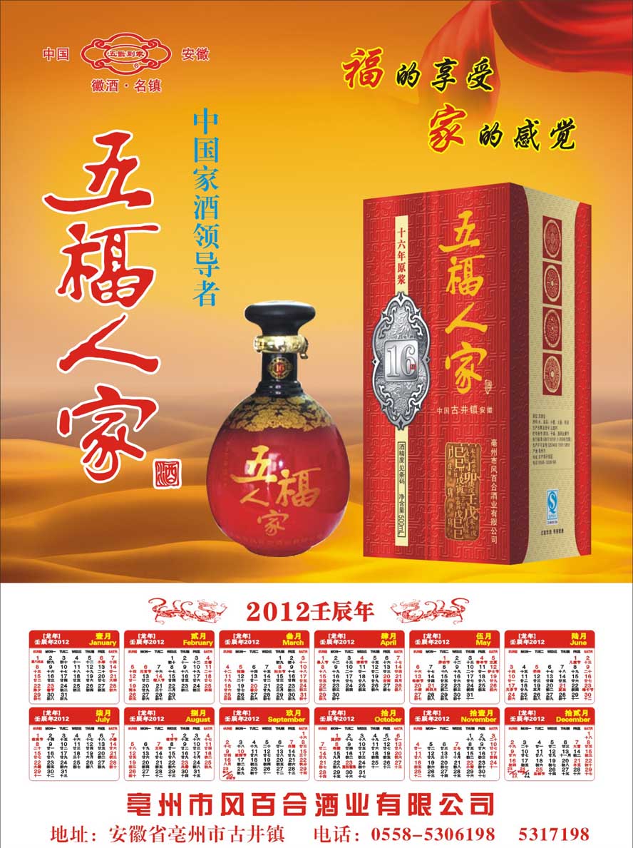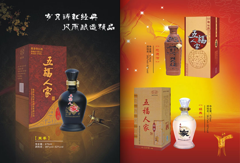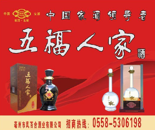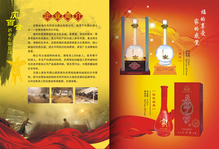 亳州市是歷史文化名城,是曹操、華佗的故鄉。更是名揚中外的酒鄉,我公司生產的五福人家系列酒,是采用甘甜、清醇的古井水,優質飽滿的高糧等糧食為主要原料,精心釀造的優質白酒,適合不同層次的消費者,深受廣大消費者的喜愛。
